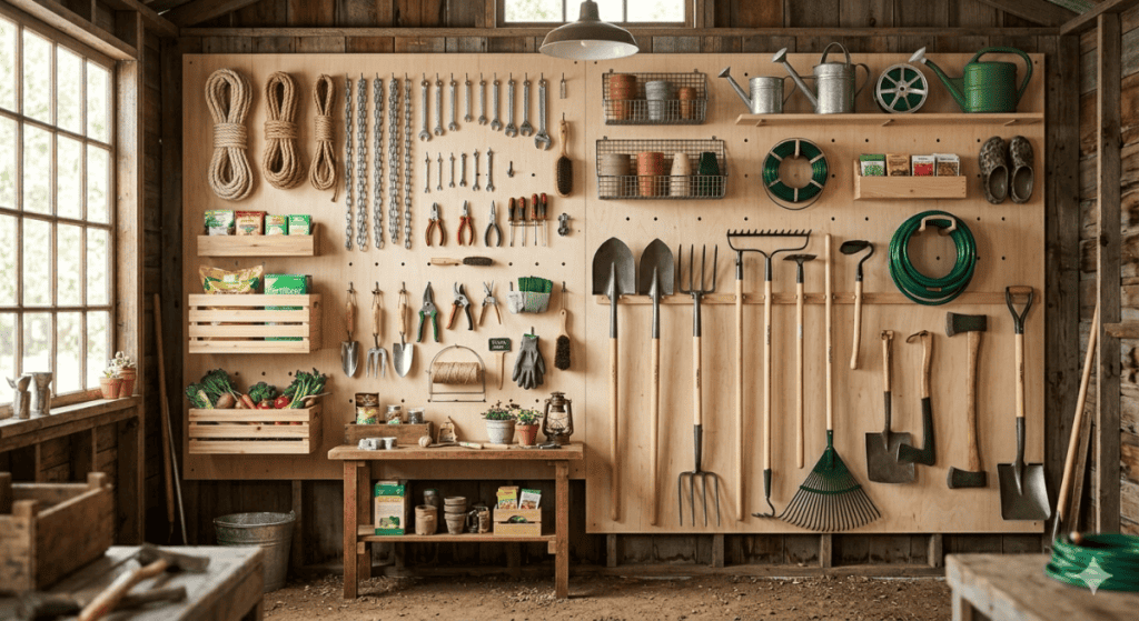 Pegboard is classic, but standard ¼-inch pegboard sags under garden tools. You need a Slatwall. This is a grooved panel system used in retail stores. It is incredibly strong and allows you to move brackets without drilling new holes every time.